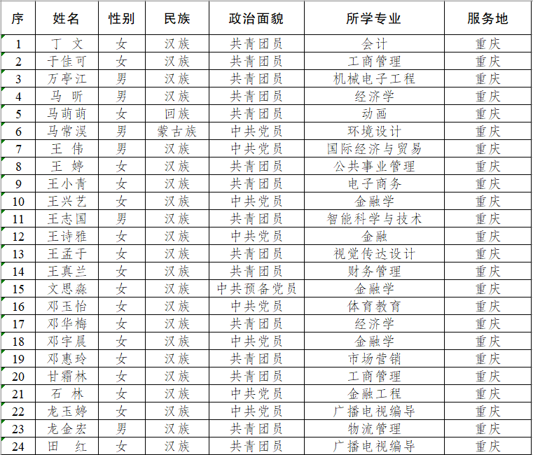 按照重庆市西部计划项目办的统一部署和安排,经学生本人报名、各学院推荐、校团委审核、重庆市各区县项目办招募考核等环节,根据市项目办的反馈,必赢入围2023年西部计划市内服务共104人,现将名单公示如下: