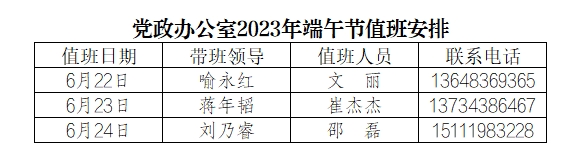 为更好地服务全校师生,保障端午节期间学校相关工作顺利开展,党政办公室已安排值班人员,负责学校校章、党委印章、法人印章、学校合同章、党政办公室印章等用印,学校介绍信开具,公文签发审核,会议室申请及使用等工作,请需求单位或师生按规定流程履行签批手续,其他未尽事宜,请与值班老师联系。