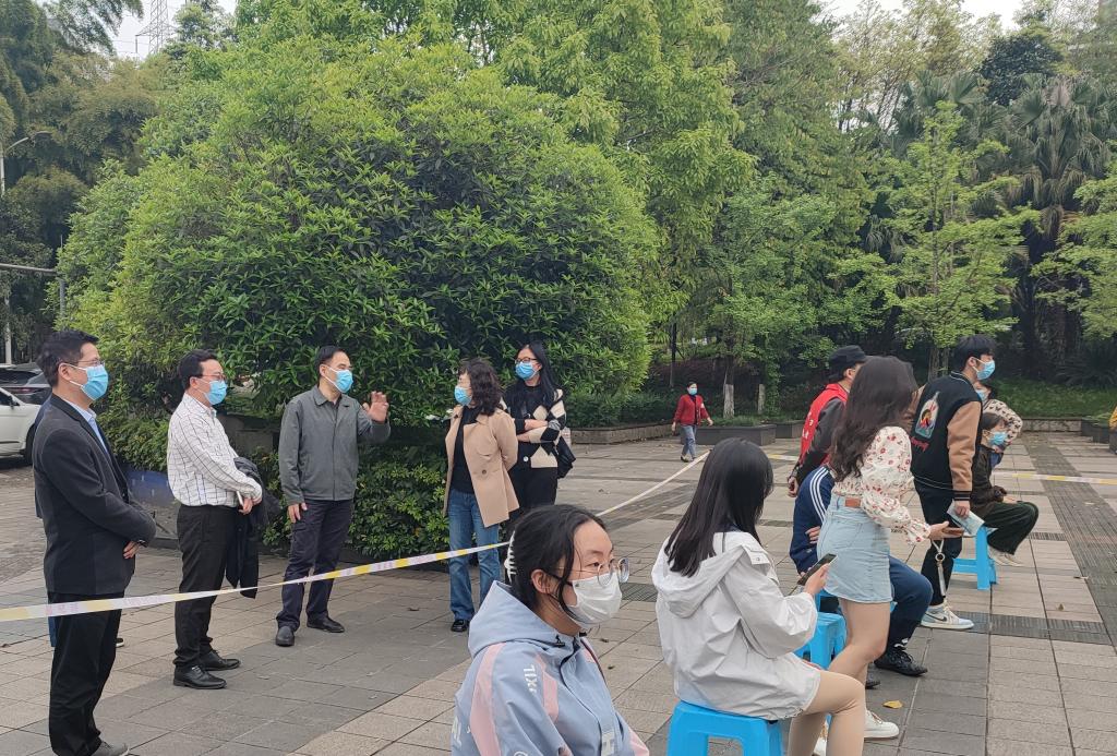 3日下午,校党委书记李志雄,党委副书记宋豫,党委常委、副校长陈兴述、李国军等分别深入南岸校区、兰花湖片区、江北校区检查指导工作,现场指挥调度,确保核酸检测顺利进行。