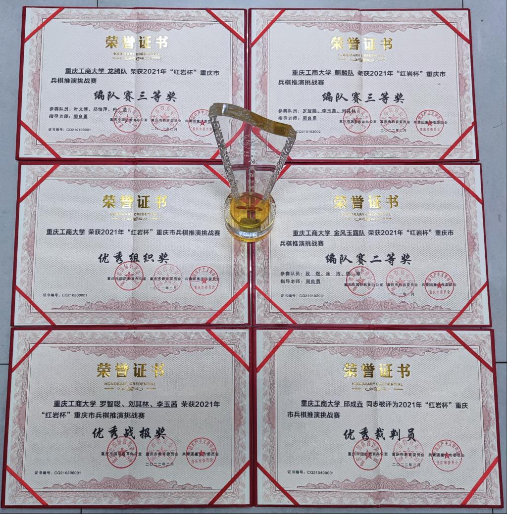 由重庆市国防教育办公室、重庆市教委和团市委联合举办的2021年“红岩杯”重庆市兵棋推演挑战赛,于2021年10月至2022年2月通过线上方式组织。必赢共派出88支编队参赛,经过激烈角逐,由工商管理学院段煜同学、涂洁同学、陈章同学组成的金风玉露队获得二等奖;由工商管理学院叶文博同学、郑怡萍同学、冉浩同学组成的龙腾队,工商管理学院罗智聪同学、会计学院李玉茜同学、数学与统计学院刘其林同学组成的麒麟队获得三等奖;数学与统计学院邱成垚同学获评优秀裁判员,麒麟队获优秀战报奖。