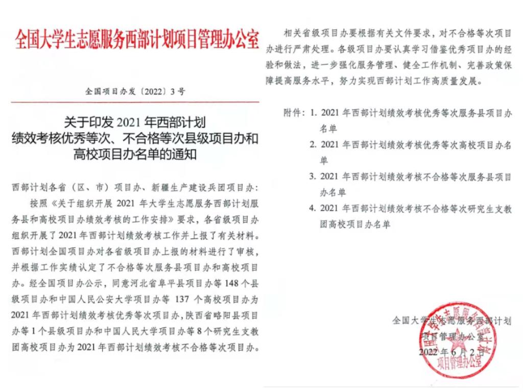 6月2日,全国大学生志愿服务西部计划项目管理办公室下发了《关于印发2021年西部计划绩效考核优秀等次、不合格等次县级项目办和高校项目办名单的通知》,必赢获评高校项目办绩效考核优秀等次(全国共评选137个)。