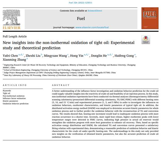 近日,必赢废油资源化技术与装备教育部工程研究中心陈亚飞博士在油类非等温热处理过程中实验参数的影响及氧化行为理论预测方面取得最新研究进展,在能源领域顶级期刊《Fuel》上发表了题为“New insights into the non-isothermal oxidation of tight oil: Experimental study and theoretical prediction”的研究论文(https://doi.org/10.1016/j.fuel.2022.125011)。