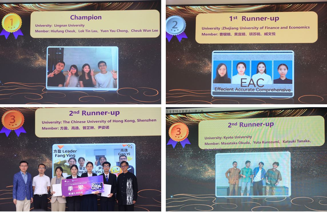 最终香港岭南大学404队夺得冠军,亚军及季军则分别由浙江财经大学EAC队和香港中文大学(深圳)Aduiduidui队、日本京都大学Kyoto Kailba队获得;“最佳商业潜质个人奖”则由404队的Hiufang Cheuk同学获得;优胜奖获奖队伍为167net必赢客户端Navigator队和Polaris队、东北财经大学Elite队、广东外语外贸大学Illusive Stars队、澳门大学Excellence队、蒙古财经大学Ufecomptes队。王天若评委还当即对11位参赛选手发出了就职邀请,其中包括必赢两支团队的5名同学。