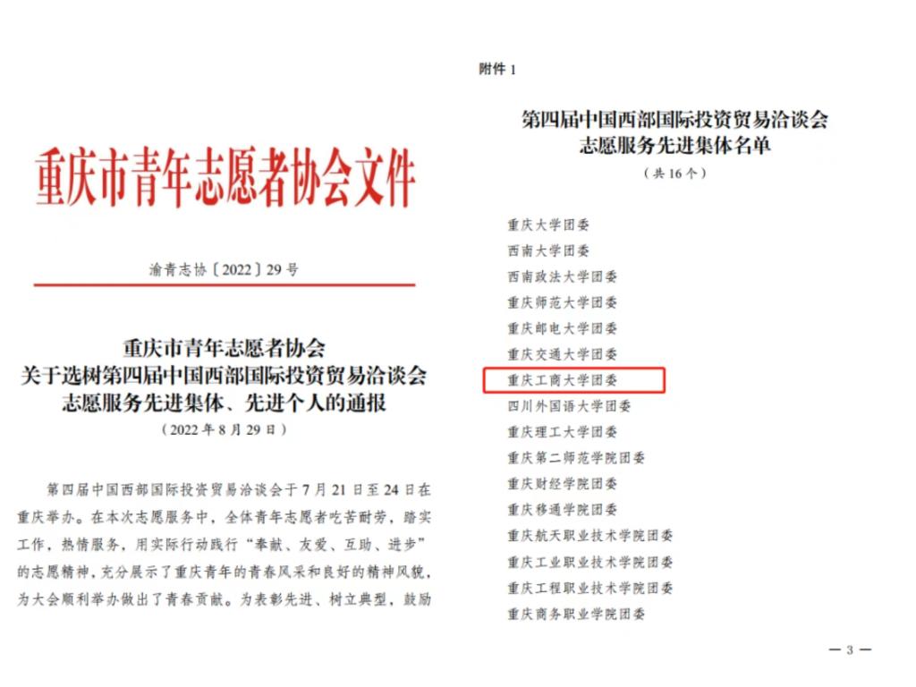 8月29日,重庆市青年志愿者协会对此次赛会服务先进集体和先进个人进行了表彰,校团委获志愿服务先进集体,经济学院刘美辰、胡文钇,工商管理学院李涛,公共管理学院梁蛟,人工智能学院苟志禹,法学与社会学学院莫朝含,国际商学院唐唯一、李鑫、吴川杏子、何岑阳熙、钟瑞景、程译巧、白云天共13名同学获评先进个人荣誉称号。