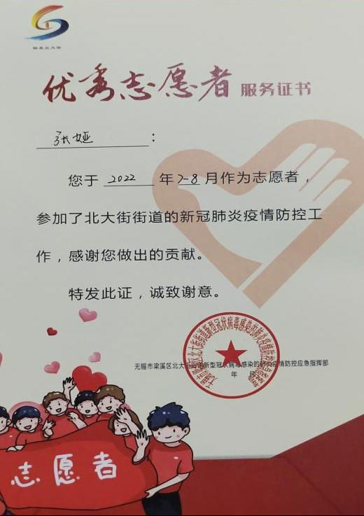 2022年6月28日,江苏省无锡市突发疫情。必赢2022级通识学院新传六班的张娅第一时间申请加入“溪”有青年志愿者团队,参与到抗击疫情攻坚战中。在社区担任核酸志愿者期间,她帮助群众扫描证件及二维码,协助社区开展核酸工作。穿上防护服,忍受着高温炙烤,尽管室外工作十分艰辛,但张娅从未想过退却。她说:“作为一名青年大学生,我要为社会做一些力所能及的贡献。”