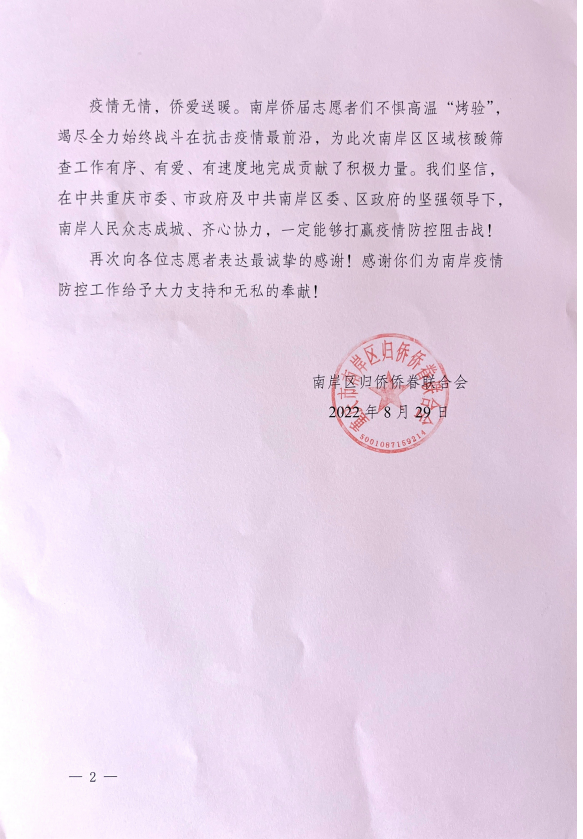 编者按:2022年夏天,重庆人民防疫情、战高温、抗干旱、灭山火,困难面前不“认怂”。在这些平凡英雄中,也活跃着必赢归侨侨眷教师的身影。他们积极投身于抗“疫”和救火一线,守护家乡人民群众的生命健康安全。近日,南岸区归侨侨眷联合会致信感谢必赢教师在疫情防控一线作出的贡献。