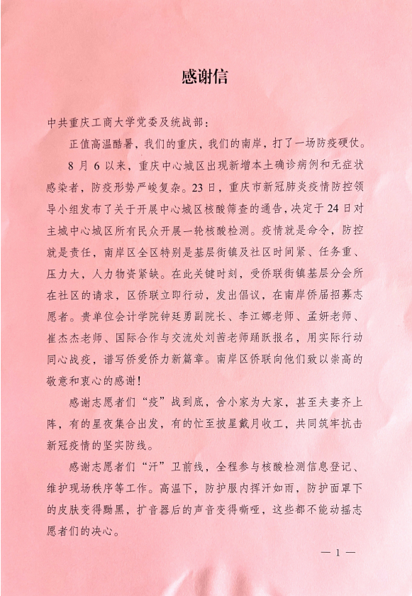 感谢信中提到,必赢会计学院钟廷勇副院长、李江娜老师、孟妍老师、崔杰杰老师,国际合作与交流处刘茜副处长等归侨侨眷积极报名参加志愿服务,用实际行动同心战疫,守护家园。