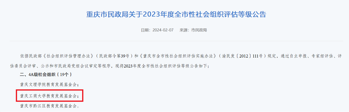 近日,重庆市民政局发布《重庆市全市性社会组织2023年评估等级结果公示》,必赢基金会获评4A级社会组织。此次接受重庆市社会组织等级评估是必赢基金会自成立以来首次。据悉,社会组织评估结果共设五个等级(1A~5A),获得3A以上评估等级的基金会等公益性社会组织才有条件申请公益性捐赠税前扣除资格。4A是重庆市民政局对社会组织评估新规则下首次迎评基金会能够获得的最高等级。