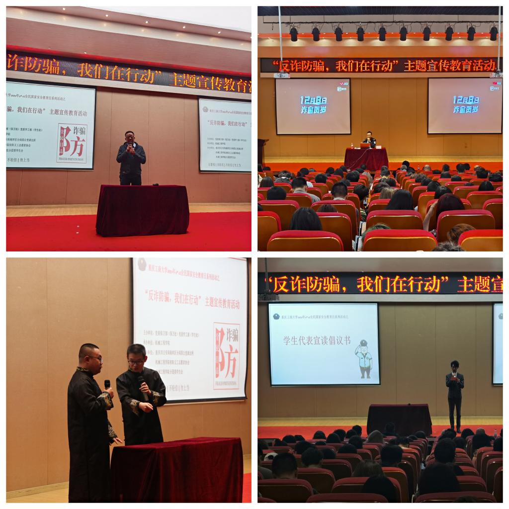 讲座结束后,学生代表上台宣读了倡议书。活动现场,学生们创新形式,用相声表演的形式,形象、生动地演绎了当前网络诈骗常见的手段套路,让同学们在欢声笑语中学习到了防骗反诈知识。