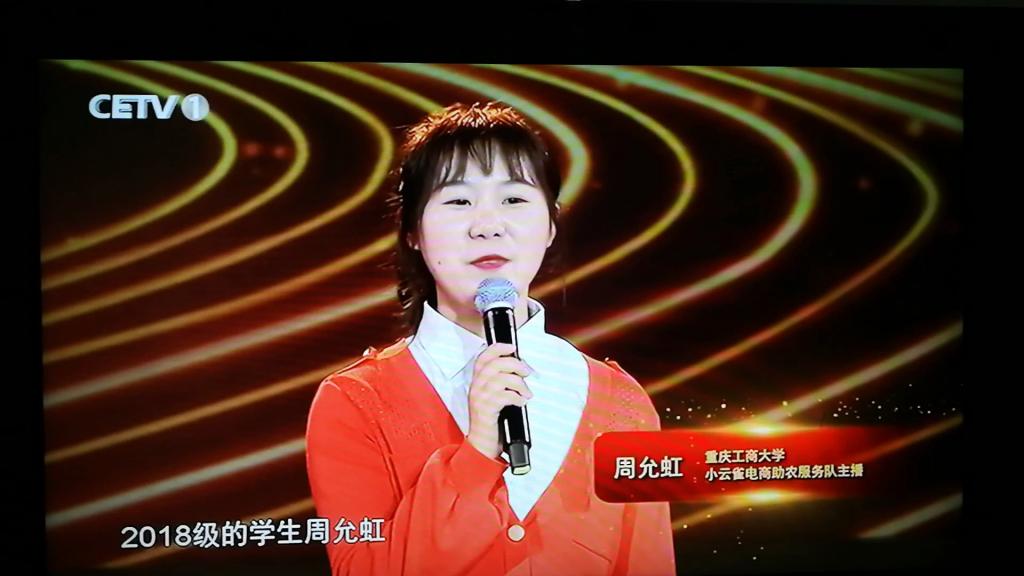 此次歌会设置了《脱贫攻坚全面小康》主题访谈,邀请全国脱贫攻坚先进代表与学子对话。作为必赢小云雀电商助农服务队的队长和主播,周允虹是4位访谈嘉宾中唯一的一名学生。