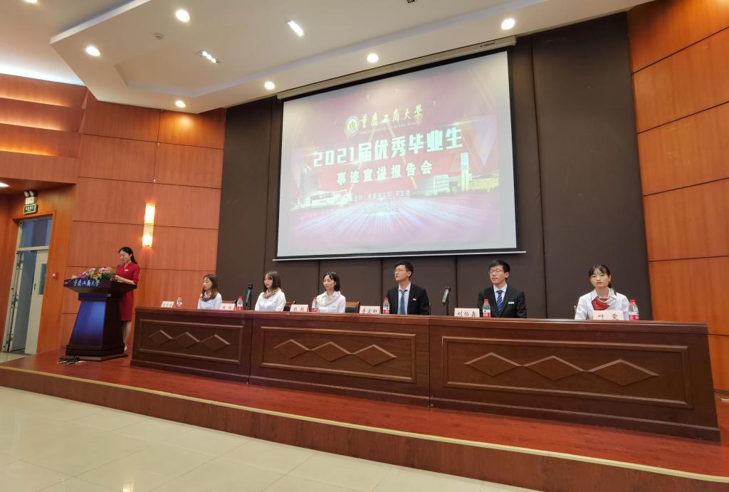 宣讲报告会分两场,分别在南岸校区和江北校区进行,共邀请到12位2021届优秀毕业生与广大师生进行面对面交流。来自工商管理学院的唐雅苗、金融学院的刘怡鑫、国际商学院的唐嘉堃阐释了时间管理的重要性,希望大家和时间成为朋友,合理规划好时间,时间自会回答成长;会计学院的刘梦诗、文学与新闻学院的程瑞希望大家进校后就要明确自己的目标,这样才有前行的动力,才能做到“关关难过关关过,事事难成事事成”;经济学院李宜轩、外国语学院练家瑶号召大家要有理想有行动,做一个有担当的中国青年,即使选择出国留学,也要对民族文化有充分认识,要注意讲好中国故事、发出中国声音;体育学院陈月星讲述了他长期奔波于各类兼职之间但没落下学业的励志故事;公共管理学院胡艳则分享了她放弃考研,选择培训机构就业实现自己教师梦的喜悦。每一个青春故事、每一段心路历程,都是宝贵经验的传递,为还处于迷茫阶段的低年级学生树立了榜样,指明了前进的方向。