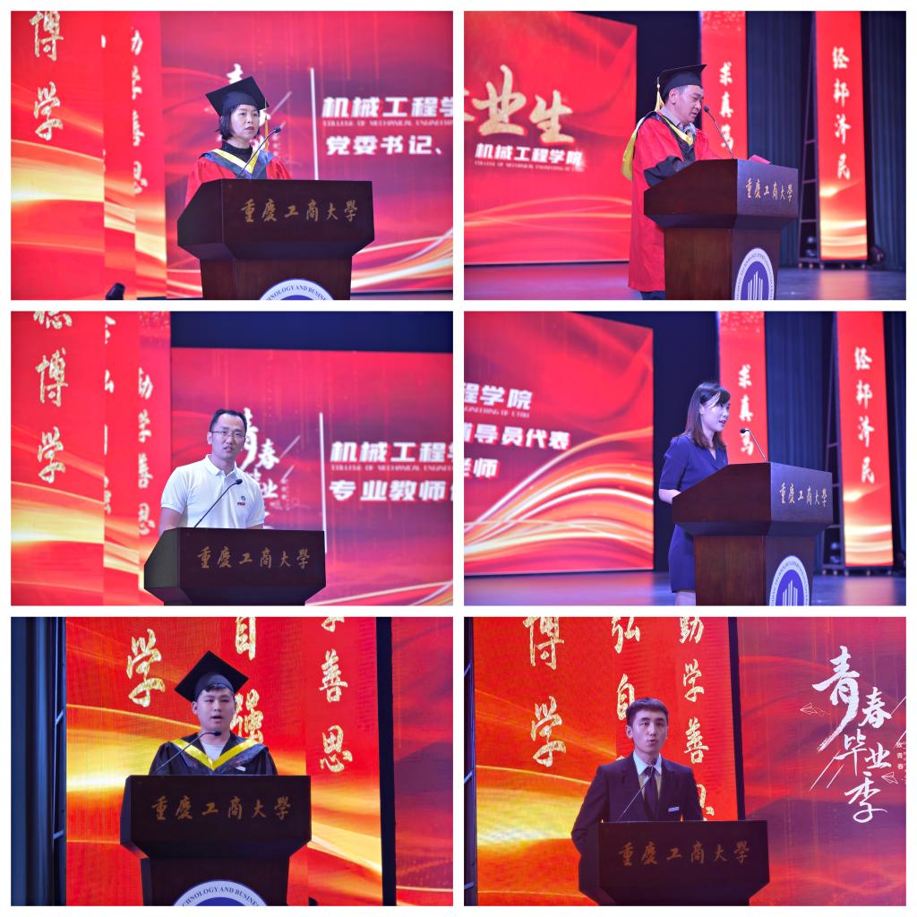 教师代表梁强发言。他指出,在专业能力上“打铁还需自身硬”,他鼓励毕业生在职业发展上“趁热打铁”。辅导员代表袁娅婷发言。她表达了对同学们的不舍,为大家的成功喝彩。张固和赵兴龙分别作为毕业生代表和在校生代表发言,他们感恩学校、学院的培养,立志成长为具有家国情怀、工匠精神的机械人。