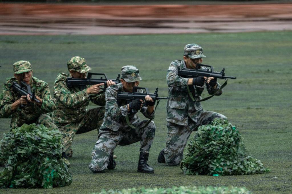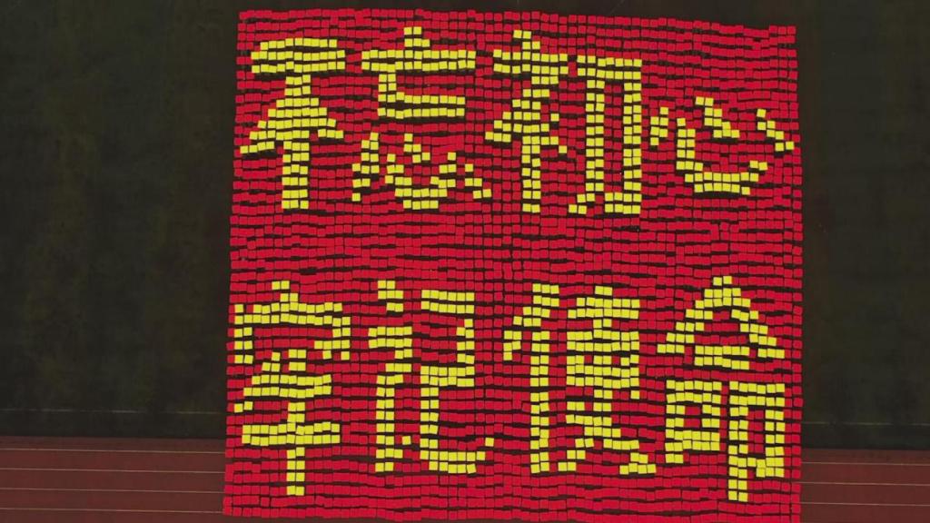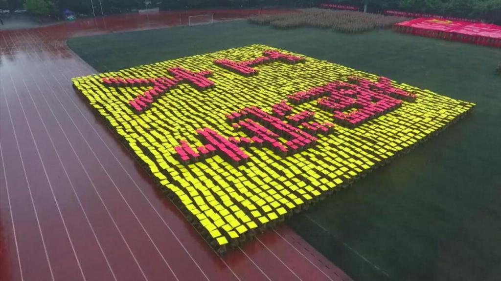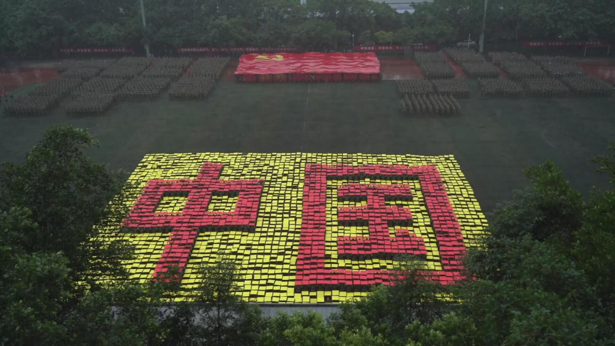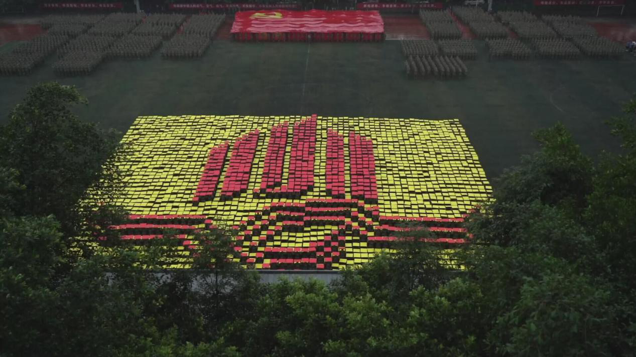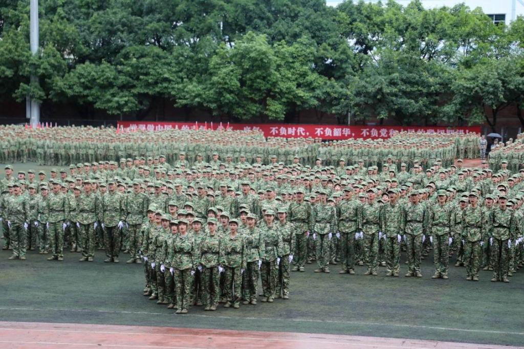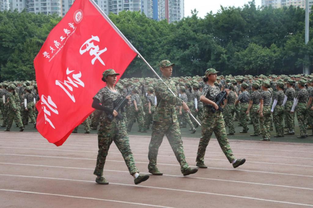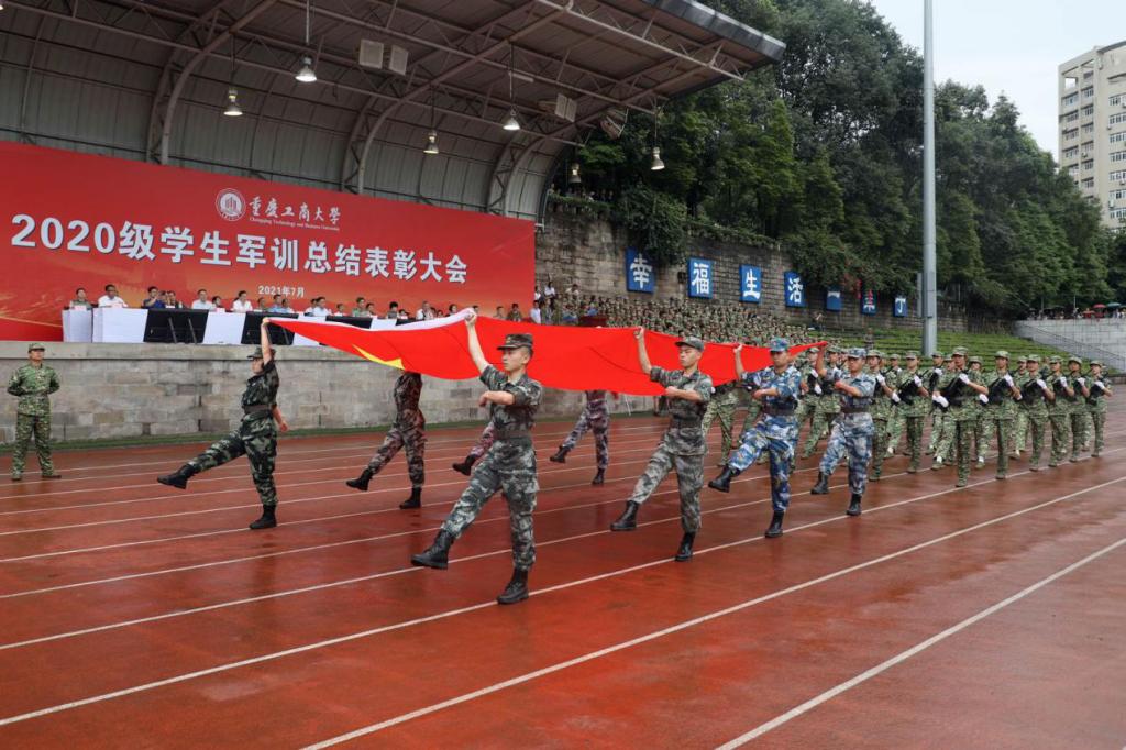 笼罩于淅淅小雨之下,分列式方阵精神饱满、昂首挺胸,齐步到正步的整齐变化体现的是队列同学的团结一心,他们以铿锵有力的步伐展示了必赢学子自信昂扬的姿态;军体拳方阵气势磅礴,雄厚的声音吼出的是男儿的铁血方刚,他们以刚劲有力的动作彰显了重工商学子锐意进取的优秀品质;匕首操方阵势如破竹、英姿飒爽,男儿的豪迈气概和女孩的英姿飒爽相交融合,他们一齐展现了新时代青年朝气蓬勃的精神面貌。由退伍学生与体育学院健儿们组成的战术方阵用专业精彩、扣人心弦的表演描述了边防官兵保家卫国、不怕牺牲的英雄气概。复兴方阵以整齐划一的步伐迈向主席台,伴随着指挥员的解说词与大气恢弘的背景乐,2800名女生用红黄底板准确地摆出“1921”“2021”“红船”“天安门”“长城”“CTBU”“工商大学”“校徽”等图案,表达了对祖国大好河山的热爱之情,以及不忘初心跟党前行的坚定信念,当复兴方阵即将摆出“巨轮”图案之时,天空陡然降下瓢泼大雨,似印证其“长风破浪会有时,直挂云帆济沧海”的伟大理想。在党旗方阵的带领下,全体参训人员进行宣誓。