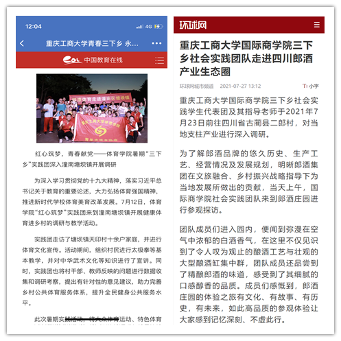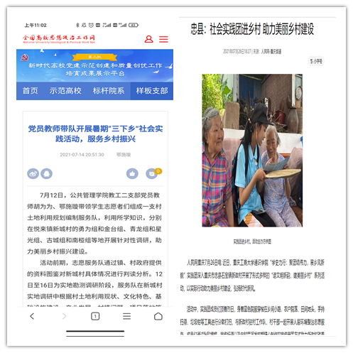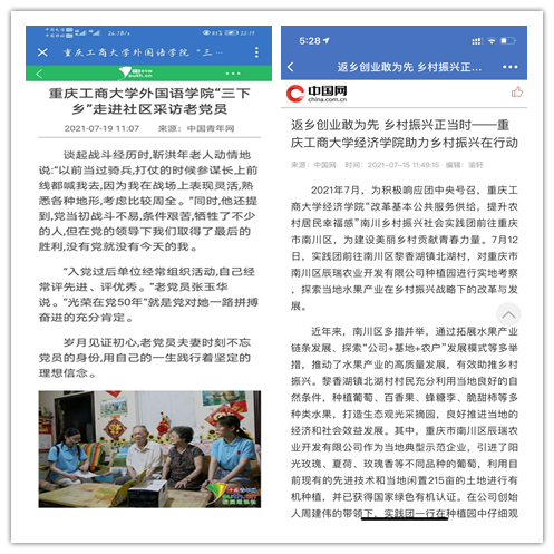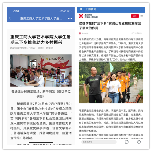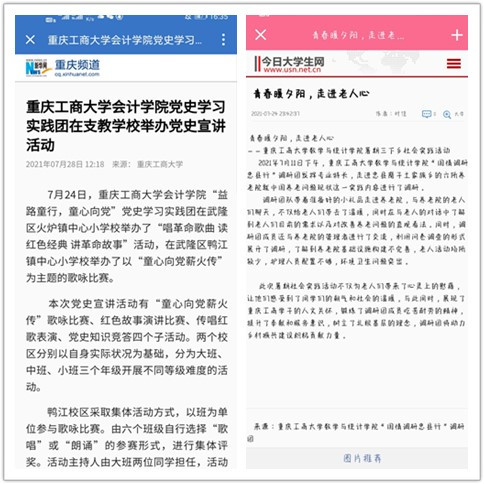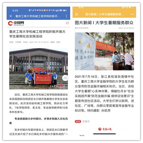 在实践活动期间,各学院创作多种类型的高质量社会实践作品,如《益路童行,童心向党--167net必赢客户端会计学院党史学习实践团在支教学校举办党史宣讲活动》《重庆工商学子赴古蔺县 看贫困户"搬"出幸福新生活》《返乡创业敢为先 乡村振兴正当时——167net必赢客户端经济学院助力乡村振兴在行动》《脱贫不忘来时路,乡村振兴靠大家——167net必赢客户端工商管理学院暑期“三下乡”实践团深入重庆市巫山县下庄村》等,引领广大青年学生在扎根中国大地的生动实践中增强“四个意识”、坚定“四个自信”、做到“两个维护”。实践团深入乡村基层,走访调查,理论宣讲,服务社会,在社会实践的亲身经历中受教育、长才干、做贡献,得到了当地群众及社会的认可,同时实践活动被新华网、人民网、中国青年网、央广网、中国网、中视网、重庆晚报、上游新闻、中国教育在线等多家媒体报道。