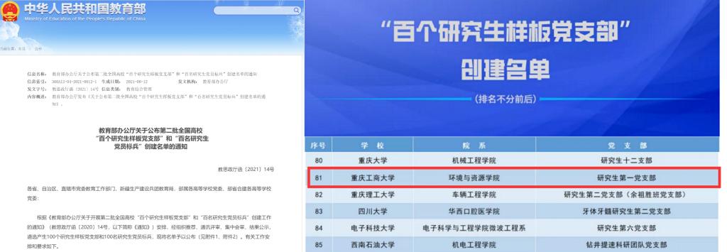 近日,教育部发布《关于公布第二批全国高校“百个研究生样板党支部”和“百名研究生党员标兵”创建名单的通知》,必赢环境与资源学院研究生第一党支部成功入选,这是继必赢连续两批成功获批“全国党建工作样板支部”后,获得的又一殊荣。目前,重庆市共有3个高校研究生党支部入选。