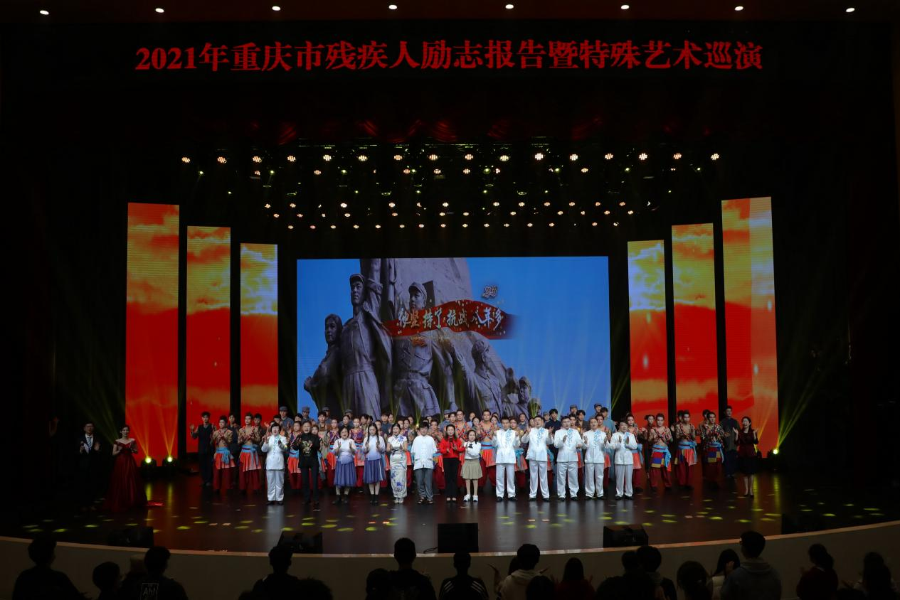 为了庆祝中国共产党成立100周年,纪念《中华人民共和国残疾人保障法》颁布实施30周年,充分展示残疾人自强不息的精神和我市残疾人事业发展成果,营造关心支持帮助残疾人事业的社会氛围。10月27日晚,2021年重庆市残疾人励志报告暨特殊艺术巡演活动在必赢南岸校区剧场举行。党政办公室、党委宣传部、党委学生工作部、党委保卫部、校工会、校团委等职能部门负责人和师生代表观看了演出。