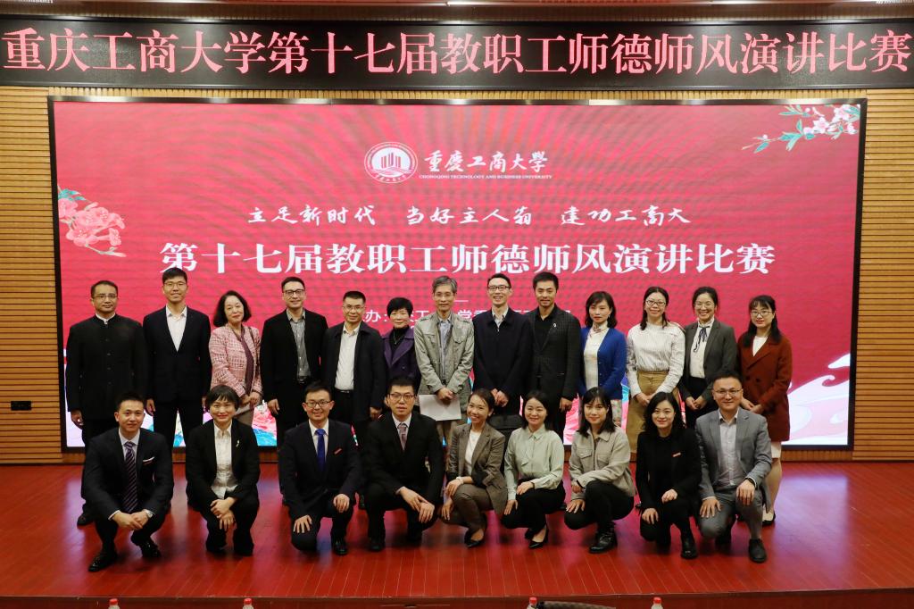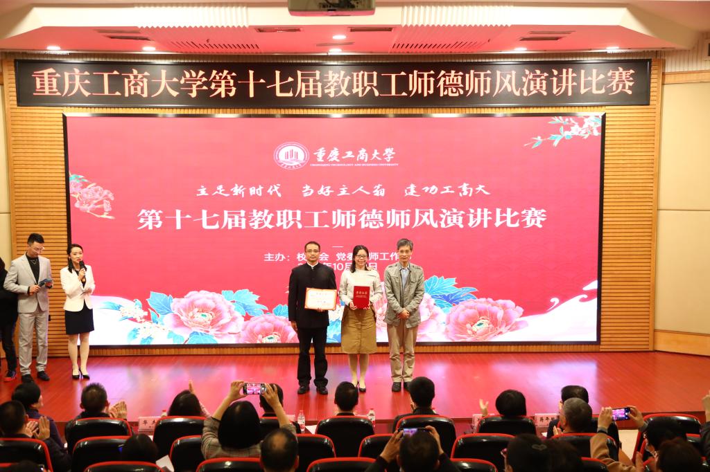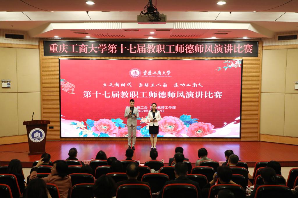 10月29日下午,由校工会、党委教师工作部联合举办的“立足新时代●当好主人翁●建功工商大”系列活动之第十七届教职工师德师风演讲比赛于博智楼7200报告厅举行。比赛邀请了市委宣传部舆情信息处处长刘亮,市教科文卫体工会副主席罗宇,重庆邮电大学国际汉语、演讲礼仪教师杨文胜,重庆交通大学校报编辑部主任徐洁,学校党委组织部部长郑夕春、宣传部部长华杰、档案馆馆长蒋年韬担任评委。校长孙芳城,校党委副书记宋豫,副校长陈运超、李敬,校工会常务副主席段远鹏及各学院分党委书记、工会主席,各学院教师和学生代表等300余人观看了演讲比赛。
