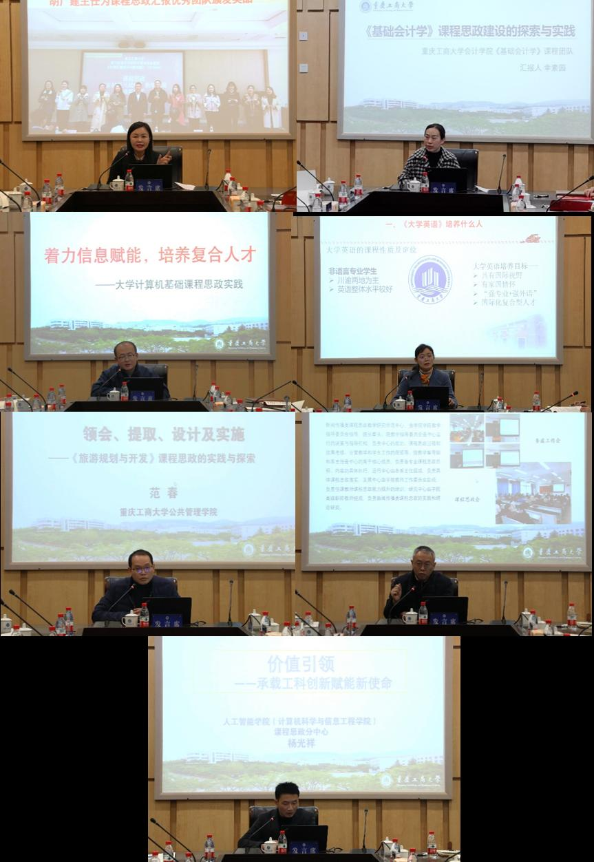 首批国家级“课程思政示范课程”——“中国区域经济问题专题”课程负责人,经济学院党委副书记、副院长王燕教授;首批国家级“课程思政示范课程”——“基础会计学”课程负责人、会计学院会计系副主任幸素园副教授;首批重庆市“高校课程思政示范课程”——“大学计算机基础”课程负责人、人工智能学院专业教师李明教授;重庆市教育科学研究院2021年思政课程与课程思政(学科德育)优秀案例及论文获奖者代表,外语学院副院长刘繁副教授、公共管理学院专业教师范春副教授;学校2021年课程思政教学研究示范分中心建设单位代表,文学与新闻学院分党委副书记、院长,中心负责人王仕勇教授;学校2021年课程思政教学研究示范分中心建设单位代表,人工智能学院副院长杨光祥教授等在会上就课程思政示范课程建设、教学实施与案例研究、建设思路与创新举措等主题作了交流发言。